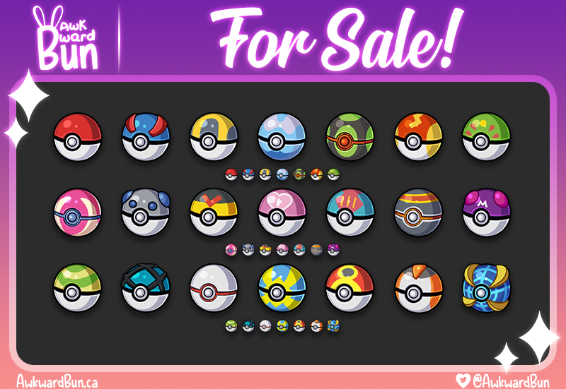 Many different types of poke balls from the Pokemon universe to use as badges (sub/loyalty or bit) for twitch.